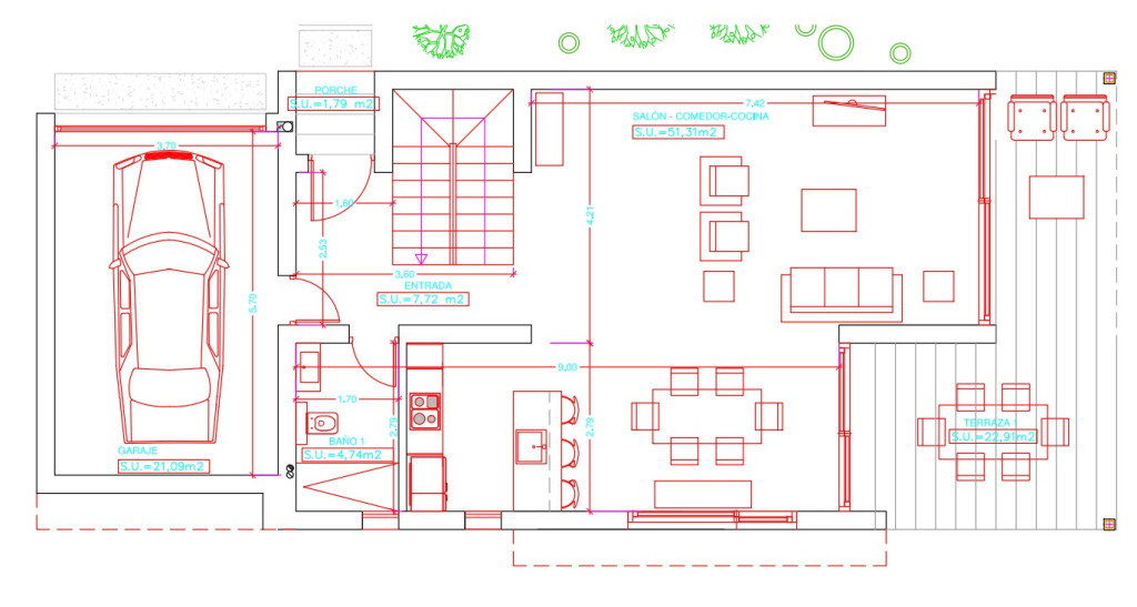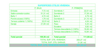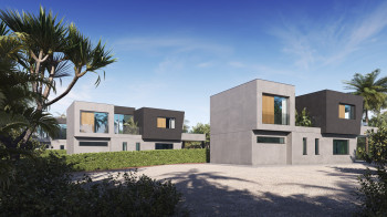 Each villa is spread over two floors. The ground floor consists of a spacious living-dining room with an adjoining open kitchen with a cooking island. For extra comfort, there is also a bathroom on this floor. On the upper floor is the master bedroom with an en-suite bathroom and a spacious terrace with a south-east orientation. There are also two spacious bedrooms that share a bathroom and a terrace. In addition, each villa has a garage on the ground floor.