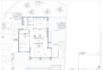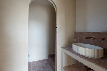 The upper floor comprises an entrance hall with guest toilet, a spacious living area with an open-plan kitchen equipped with BOSCH appliances and a BORA hob with integrated extraction, combined with custom-made cabinetry and porcelain worktops by RAGNO Italia. There are also two bedrooms, each with its own en-suite bathroom, ensuring maximum comfort and privacy. The lower floor houses a separate bedroom or studio with en-suite bathroom and the option to install a kitchenette, making it ideal as a guest accommodation. Throughout the living areas and bedrooms, fixed furniture and accents in MATTEO BRIONNI clay, solid oak doors and built-in wardrobes create a warm, natural atmosphere. The bathrooms are stylishly finished with high-quality sanitary fittings. Polished concrete floors run throughout the interior of the property, while terracotta tiles are used outdoors.
