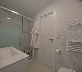 The renovated ground floor includes a comfortable living room with underfloor heating, a functional open-plan kitchen with separate laundry area, one bedroom and a full bathroom. From this floor, there is direct access to the private solarium, a highly valued space for sunbathing, relaxing, or enjoying open views in a chill-out atmosphere.