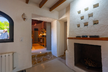 The main house is distributed over two floors and combines characterful elements with comfortable living spaces. You enter into a spacious and cosy naya overlooking the garden, which flows into the dining room with fireplace. Adjacent is the kitchen, with direct access to a charming patio, perfect for outdoor cooking and dining. The ground floor also features a bedroom and a bathroom.