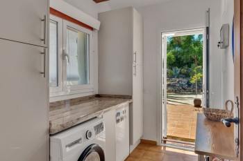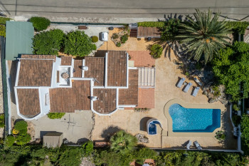 The beautiful, well-kept garden is equipped with an automatic irrigation system and a practical storage room. The villa features two kitchens (one on each floor), three spacious bedrooms —including a dressing room— and three full bathrooms. Partially renovated and in excellent condition, the home offers plenty of opportunities to add more bathrooms or suites.