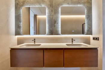 La villa tiene una superficie total construida de 425 m2, se distribuye en tres plantas y está equipada con ascensor para el máximo confort. La planta baja consta de un amplio salón con zona de comedor, una sala de estar y una cocina abierta totalmente equipada con una isla de cocina. Además, en esta planta hay un dormitorio doble muy espacioso con baño en suite y un aseo de invitados. Tanto desde el dormitorio como desde el salón hay acceso directo a la terraza junto a la piscina a través de ventanas correderas. La planta superior consta de tres dormitorios dobles, cada uno con baño en suite y con acceso a una terraza cubierta. El sótano consta de un garaje con espacio para dos coches, un lavadero, dos salas técnicas y una sala polivalente. La villa cuenta con una terraza solárium y una terraza cubierta junto a la piscina y estará rodeada de un hermoso jardín mediterráneo con riego automático. La piscina está equipada con iluminación y hay un baño exterior.