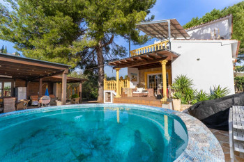 El exterior ha sido diseñado para disfrutar al máximo del clima mediterráneo. La parcela dispone de una piscina privada, zona de barbacoa, espacios deportivos y área infantil. Además, la propiedad incluye una vivienda auxiliar para invitados de 30 m², totalmente equipada con baño y terraza, ideal para visitas o como alojamiento independiente. El aparcamiento cubierto permite estacionar cómodamente dos vehículos.