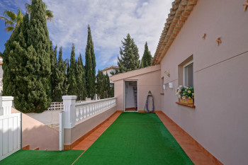 The property is located on the upper floor of a detached villa, offering privacy and tranquility. Access is via stairs leading to a spacious terrace that connects the storage/laundry room to the main entrance. From the entrance hall, the rooms are distributed as follows: three bedrooms (two doubles and one single, all with built-in wardrobes), a full bathroom, a separate kitchen, and a bright living-dining room with direct access to a stunning outdoor terrace, perfect for enjoying the Mediterranean climate, al fresco dining, and moments of relaxation.
