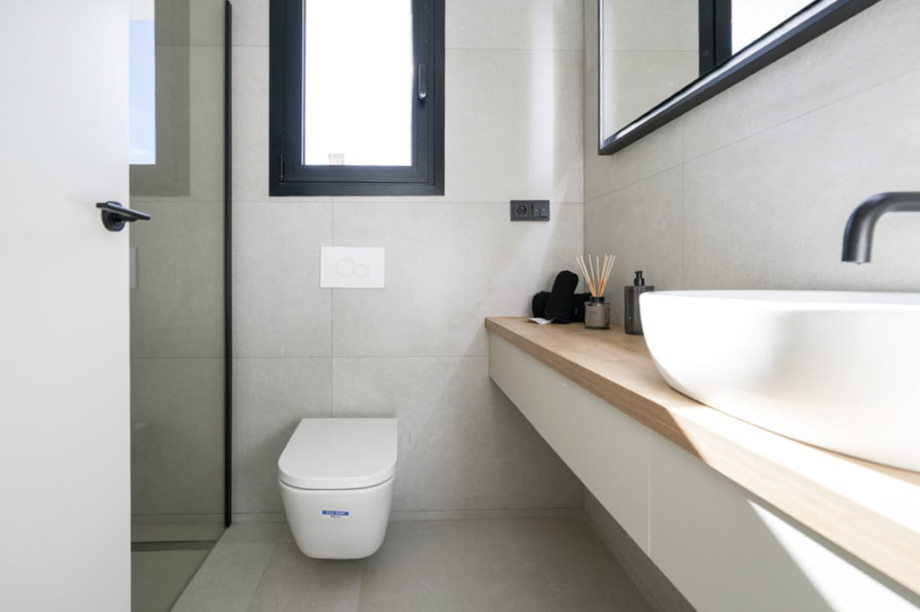 Double-glazed windows with solar control and motorised shutters / Anti-slip tiles on terraces and in garage / Bathrooms with Roca brand wall-mounted sanitaryware, washbasins on wooden worktop, matt black taps, towel radiators and showers covered with anti-slip porcelain tiles / Air conditioning and underfloor heating throughout the house by means of ARISTON aerothermal system with heat pump and 150-litre storage tank / Extralink Smartlife home automation system with touch screen to control outdoor lighting, alarm and motors.
