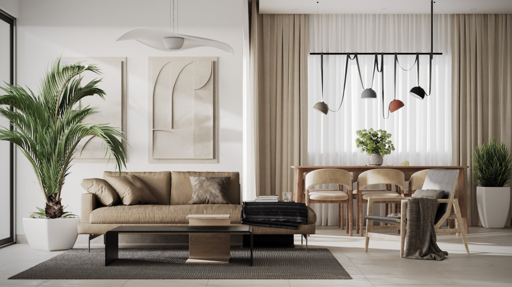 Each villa is spread over two floors. The ground floor consists of a spacious living-dining room with an adjoining open kitchen with a cooking island. For extra comfort, there is also a bathroom on this floor. On the upper floor is the master bedroom with an en-suite bathroom and a spacious terrace with a south-east orientation. There are also two spacious bedrooms that share a bathroom and a terrace. In addition, each villa has a garage on the ground floor.