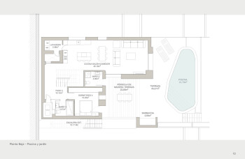 You enter the upper floor into a spacious hall, on this floor there are three spacious double bedrooms, each with an en-suite bathroom. The ground floor houses the living area, consisting of a spacious living-dining room with an open kitchen with a cooking island and a laundry room. For added comfort, there is a fourth bedroom with an en-suite bathroom on this floor. Both the living room and the bedroom offer direct access to the terrace by the pool, which also has a barbecue area. In addition, the villa also has a fully equipped outdoor bathroom, a storage room and parking space for two cars. For optimal comfort, both hot/cold air conditioning and underfloor heating are installed, which can be controlled via the AIRZONE system.