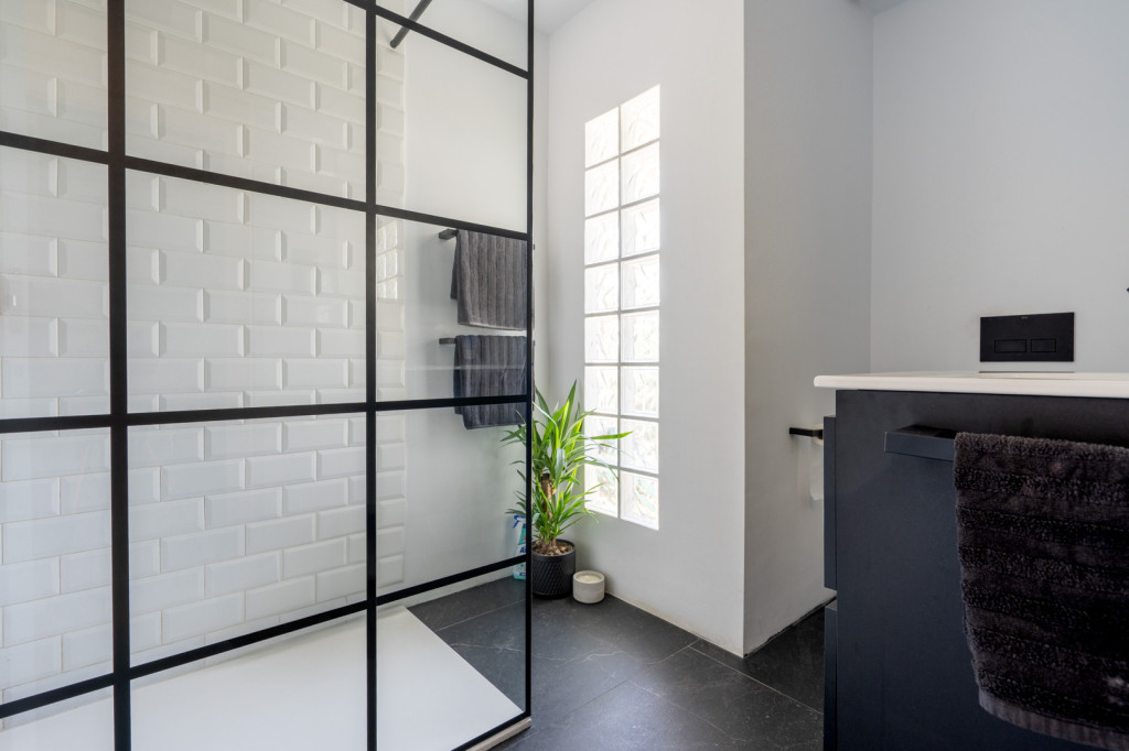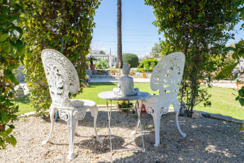 This 6-bedroom villa is located on a fully fenced, beautifully landscaped plot of up to 2885 m2 and offers beautiful views of the Montgó. The villa has a total built area of 391 m2 and is spread over two floors. The villa (excluding guest house ) was renovated in 2023. Through a large wooden door you enter an open space with a lounge with a stove on the left and a dining area and stairs to the upper floor on the right. Adjacent to the dining area is the open kitchen with an American bar. At the end of the room is an office area and access to the master bedroom and two bathrooms. The master bedroom has fitted wardrobes along both sides. Stairs lead to a naya that gives access to a corridor where there are three more bedrooms and a modern bathroom. From the naya you also reach a large covered terrace connected to the guest house. The guest house also features private access via an external staircase. This part consists of a lounge, a kitchen, two bedrooms and a bathroom and is in need of renovation. The main house has fans, air conditioning and central heating, allowing you to maintain a pleasant indoor climate all year round.