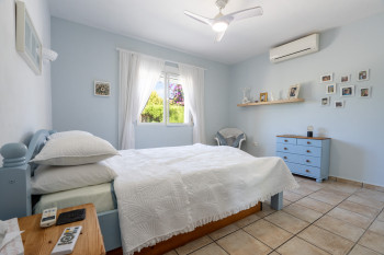 A few steps lead to the veranda at the front door and into an entrance hall. From the hall, you enter the spacious, open kitchen with an adjoining dining area. Next to the dining area is a  living room with a fireplace. The eastern side of the villa features a master bedroom with an en-suite bathroom and two bedrooms with a shared bathroom. All bedrooms have built-in wardrobes, shutters and air conditioning. The villa features underfloor heating and a fireplace to guarantee maximum confort all year round. Besides the villa has a laundry room located in between the kitchen and the hallway. Outside, there is a spacious covered terrace on both the south and west side of the villa. There is also a large swimming pool with an outdoor kitchen and an outdoor bathroom. Ideal to spend long summer evenings outdoors. The villa is surrounded by a mature Mediterranean garden and has several parking spaces, a carport and a storage room.