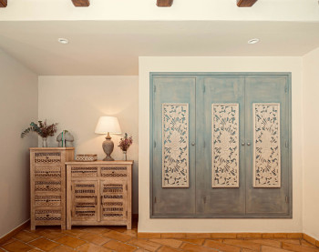 Through a spacious entrance hall you enter a bright living and dining area with an adjacent open-plan fully equipped kitchen. This level also features a bedroom with en-suite bathroom, a guest toilet and a separate laundry room. In addition, there is an extra bedroom with private access and its own bathroom, ideal for guests. From the living area there is a direct access to a charming interior patio and a large traditional naya with a lounge and an outdoor kitchen.
