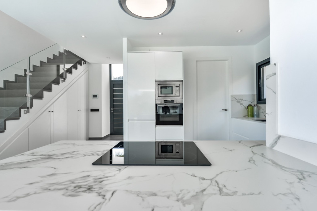 The kitchen is fully equipped with built-in appliances including a ceramic hob, oven, microwave, dishwasher and high-quality bespoke cabinetry. The property is heated by an air-source heat pump supported by solar energy and features a central air conditioning system that efficiently cools and heats the different areas of the house.
