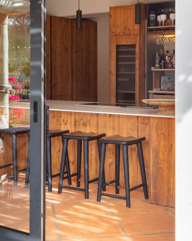The heart of the residence is its spectacular open-plan kitchen and living area, where a soaring double-height ceiling draws the eye upward to a mezzanine level — a naturally lit retreat perfectly suited as a home office or quiet reading room. The kitchen itself is a statement: De Dietrich appliances throughout, a generous central island designed for both serious cooking and relaxed entertaining, a dedicated bar area, and a separate pantry kitchen that keeps the social spaces exactly that — social.